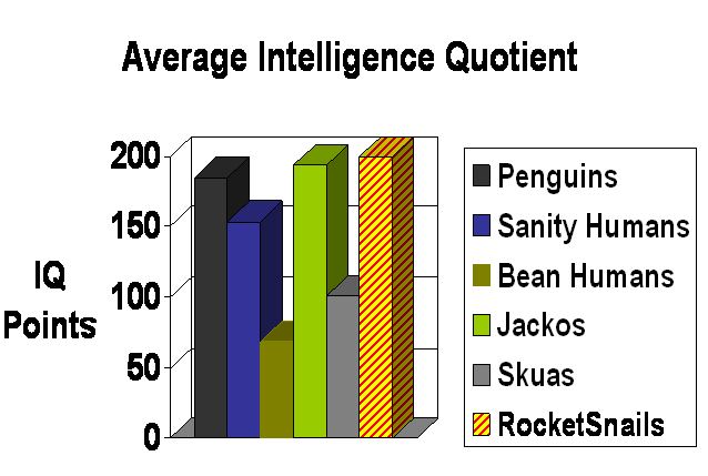 An average IQ chart, shown representing Penguins, Sanity Humans, Bean Humans, Jackos, Skuas, and RocketSnails, respectively.